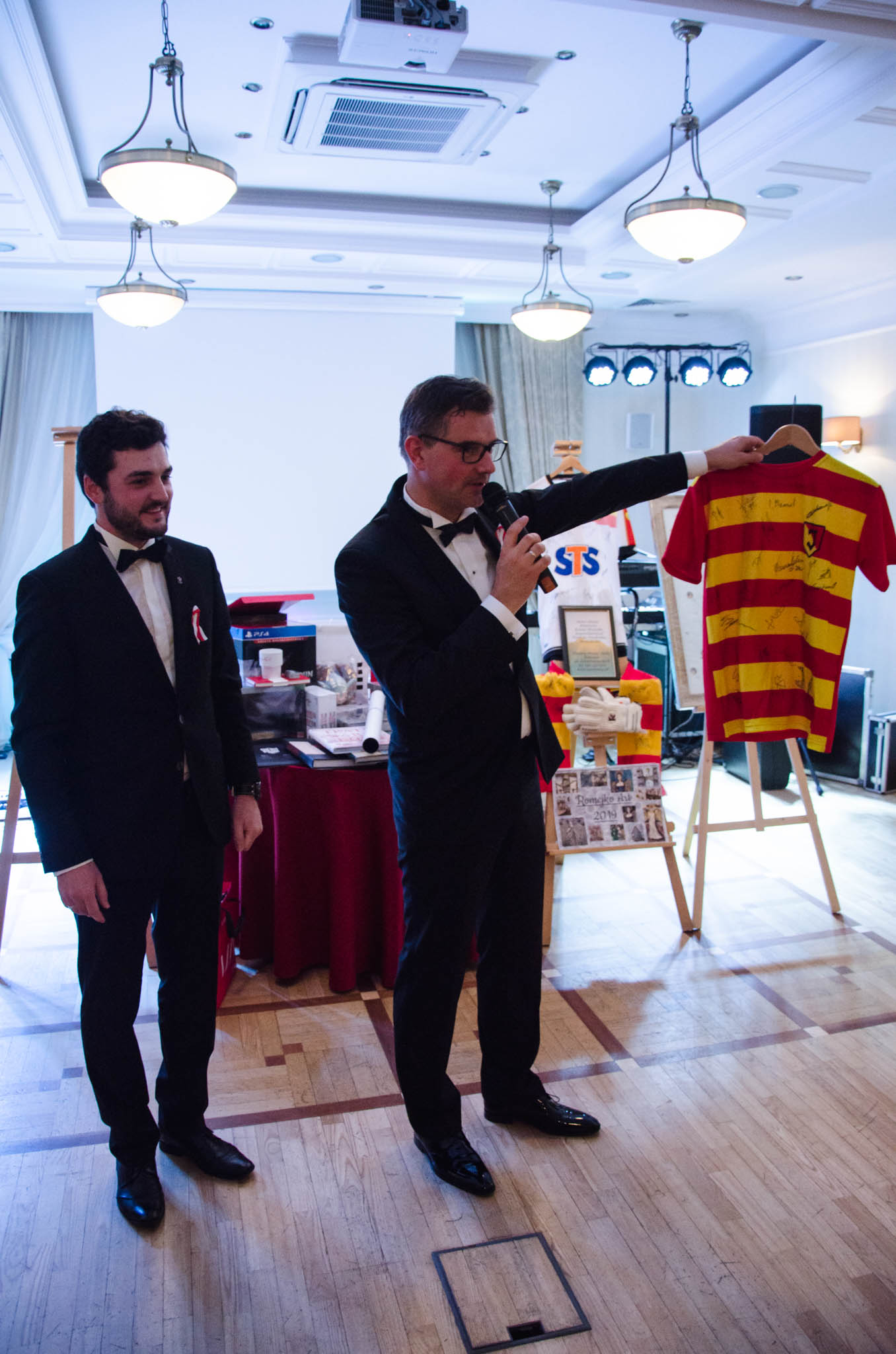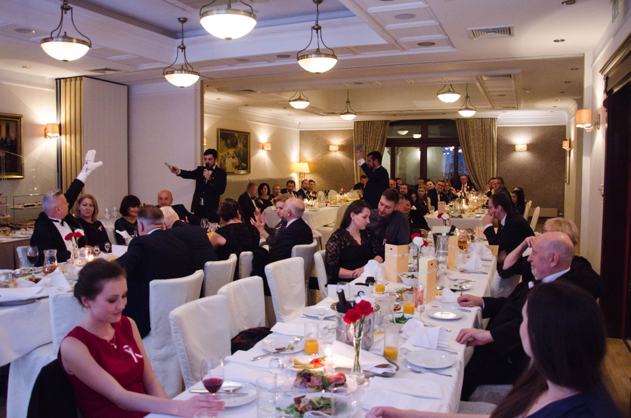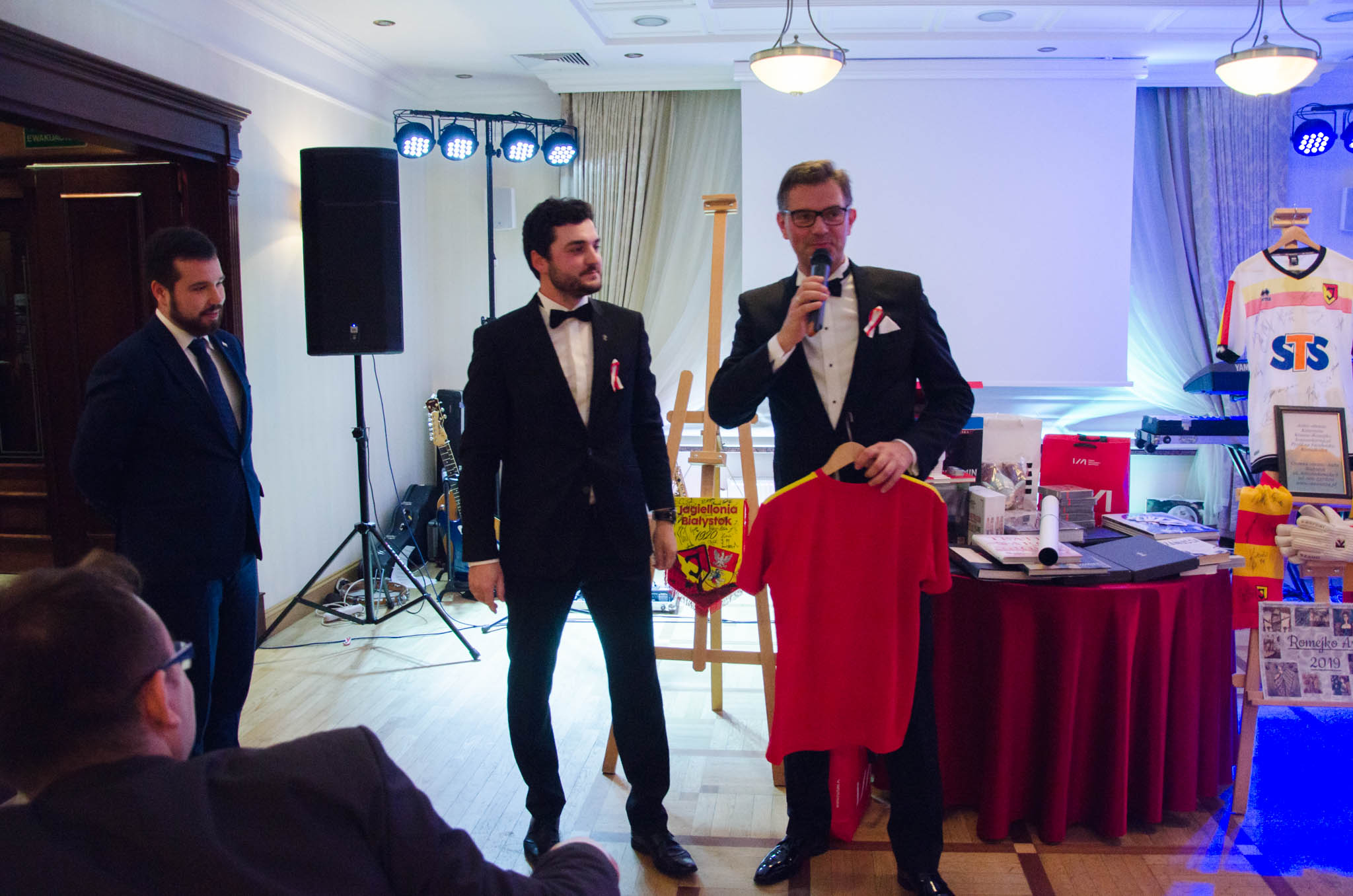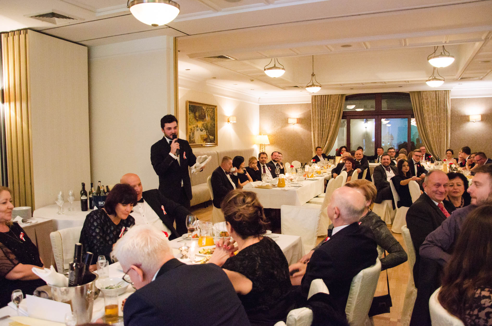 W balu wzięli udział działacze i sympatycy PIRS oraz PTG, lokalni przedsiębiorcy, naukowcy a także podlascy społecznicy. Przyjęcie rozpoczęliśmy przywitaniem gości przez naszego gospodarza – Wojciecha Strzałkowskiego, Piotra Lussę (PTG) oraz Jacka Słomę (PIRS). Po toaście i posmakowaniu pierwszych dań przyszedł czas na wspólne tańce, które prowadził zespół RAYA z Elżbietą Nadolną na czele. W tle rozbrzmiewały utwory z okresu dwudziestolecia międzywojennego, a także współczesne szlagiery. Ciekawe dysputy przedsiębiorców i działaczy społecznych przeplataliśmy ze śpiewami pieśni patriotycznych, które od godziny 21:00 prowadził niezastąpiony Wojciech Strzałkowski. O godzinie 23:00 nastąpił kulminacyjny punkt naszego balu, w którym to rozpoczęła się dobroczynna licytacja przedmiotów na rzecz wsparcia zakupu protezy nogi dla utalentowanej multimedalistki w pływaniu Pani Annie Omielan. W tym miejscu należy podziękować Michałowi Mucha oraz Wojciechowi Strzałkowskiemu za przekazanie na rzecz licytacji wielu przedmiotów z dziedziny sportu i kultury. Licytację poprowadził Jacek Słoma. Pierwsza zlicytowana została koszulka domowa Jagiellonii Białystok z podpisami piłkarzy, której szczęśliwym posiadaczem okazał się Tomasz Janik (prezes PTG). W trakcie licytacji niejednokrotnie dochodziło do pasjonującej i napiętej rywalizacji. W sumie dzięki hojności gości, udało nam się zebrać ponad 14.000 zł.