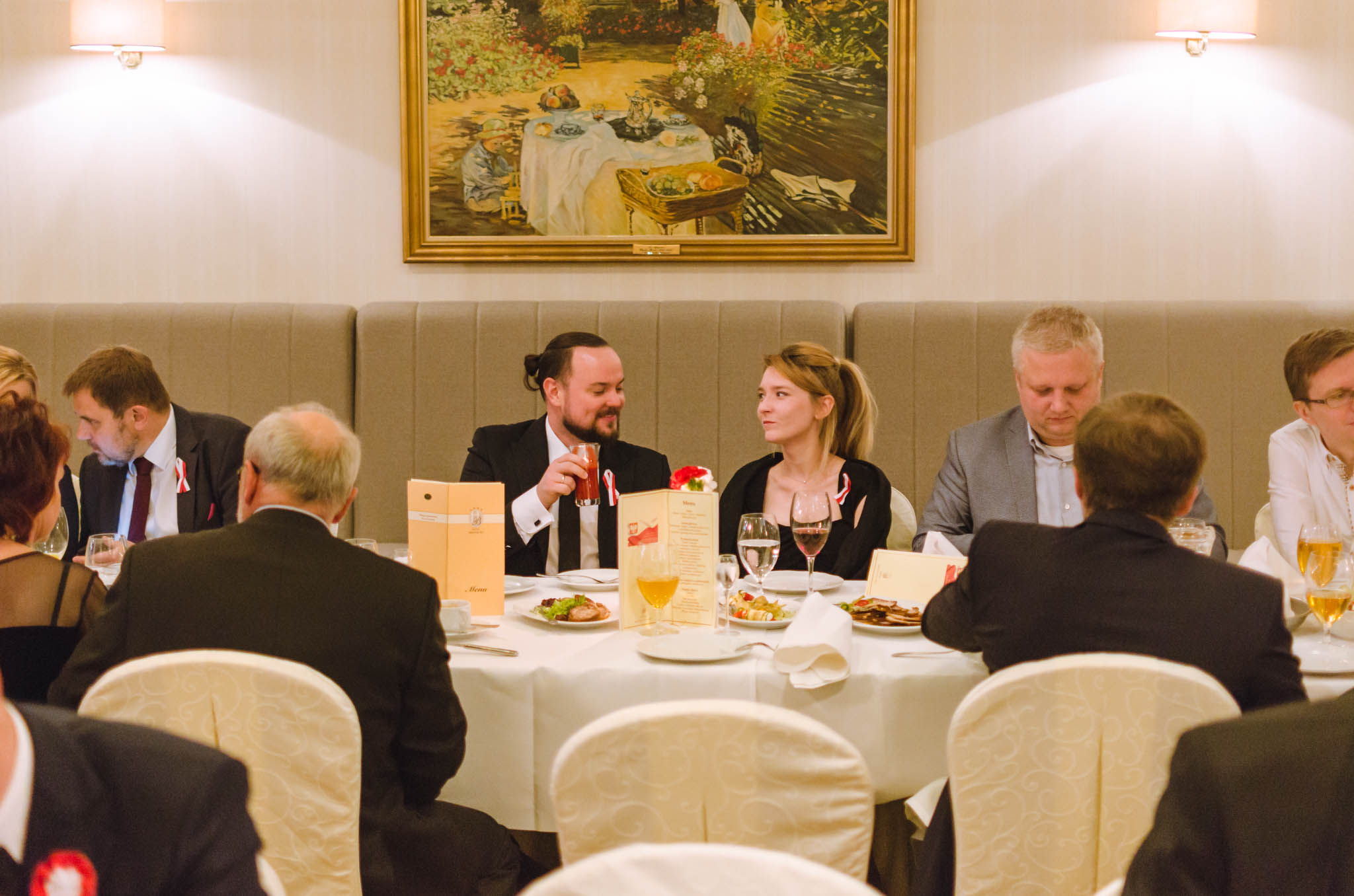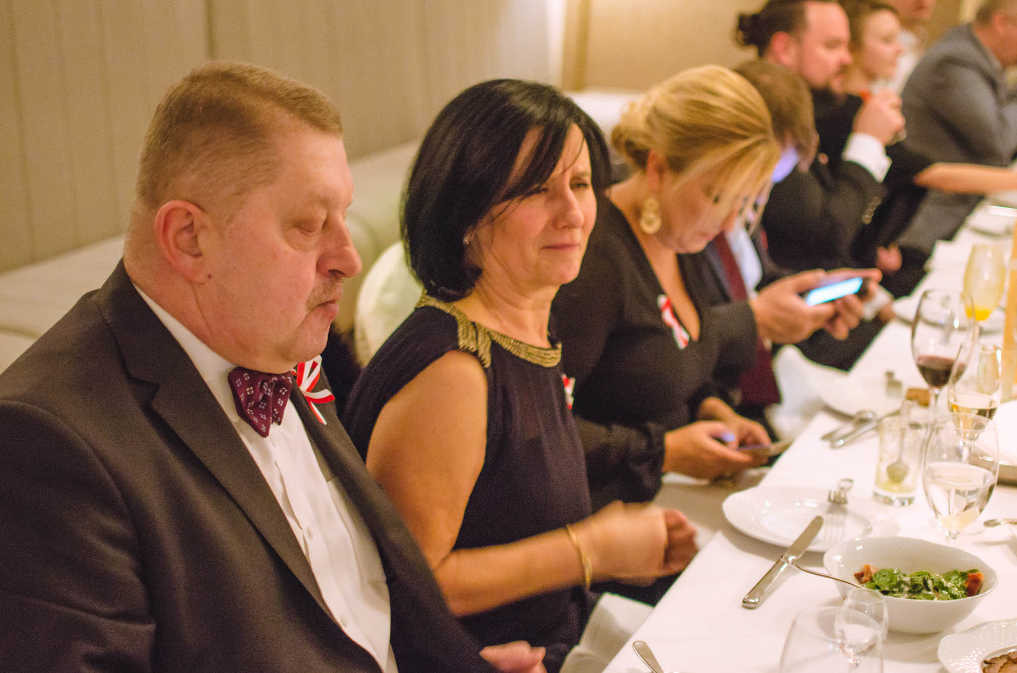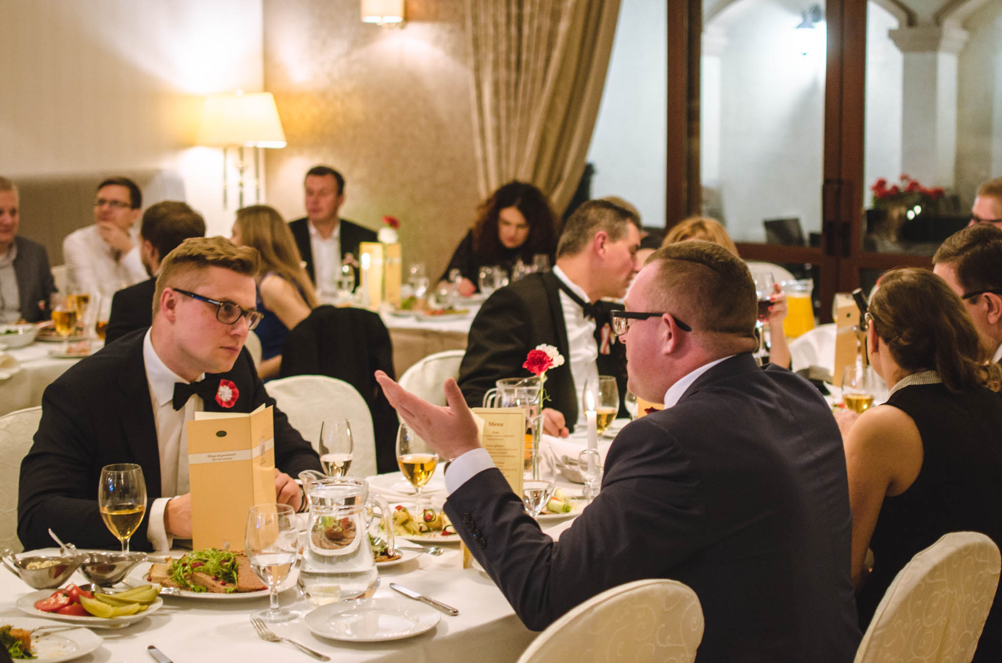 W balu wzięli udział działacze i sympatycy PIRS oraz PTG, lokalni przedsiębiorcy, naukowcy a także podlascy społecznicy. Przyjęcie rozpoczęliśmy przywitaniem gości przez naszego gospodarza – Wojciecha Strzałkowskiego, Piotra Lussę (PTG) oraz Jacka Słomę (PIRS). Po toaście i posmakowaniu pierwszych dań przyszedł czas na wspólne tańce, które prowadził zespół RAYA z Elżbietą Nadolną na czele. W tle rozbrzmiewały utwory z okresu dwudziestolecia międzywojennego, a także współczesne szlagiery. Ciekawe dysputy przedsiębiorców i działaczy społecznych przeplataliśmy ze śpiewami pieśni patriotycznych, które od godziny 21:00 prowadził niezastąpiony Wojciech Strzałkowski. O godzinie 23:00 nastąpił kulminacyjny punkt naszego balu, w którym to rozpoczęła się dobroczynna licytacja przedmiotów na rzecz wsparcia zakupu protezy nogi dla utalentowanej multimedalistki w pływaniu Pani Annie Omielan. W tym miejscu należy podziękować Michałowi Mucha oraz Wojciechowi Strzałkowskiemu za przekazanie na rzecz licytacji wielu przedmiotów z dziedziny sportu i kultury. Licytację poprowadził Jacek Słoma. Pierwsza zlicytowana została koszulka domowa Jagiellonii Białystok z podpisami piłkarzy, której szczęśliwym posiadaczem okazał się Tomasz Janik (prezes PTG). W trakcie licytacji niejednokrotnie dochodziło do pasjonującej i napiętej rywalizacji. W sumie dzięki hojności gości, udało nam się zebrać ponad 14.000 zł.